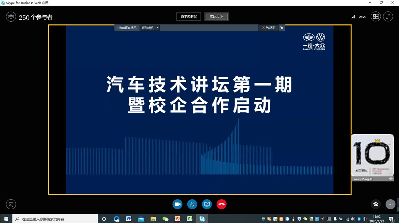 4月22日,色情网 与一汽-大众汽车有限公司合作举办的汽车技术讲坛在线上开讲。汽车仿真与控制国家重点实验室曾小华教授进行了主题为《节能与新能源汽车技术进展》的讲座。一汽-大众有限公司技术研发部李丹总监、黄杰书记,色情网 高振海院长、雷雨龙副院长参加线上启动仪式。一汽-大众有限公司技术研发部260名员工在线上参加讲座。