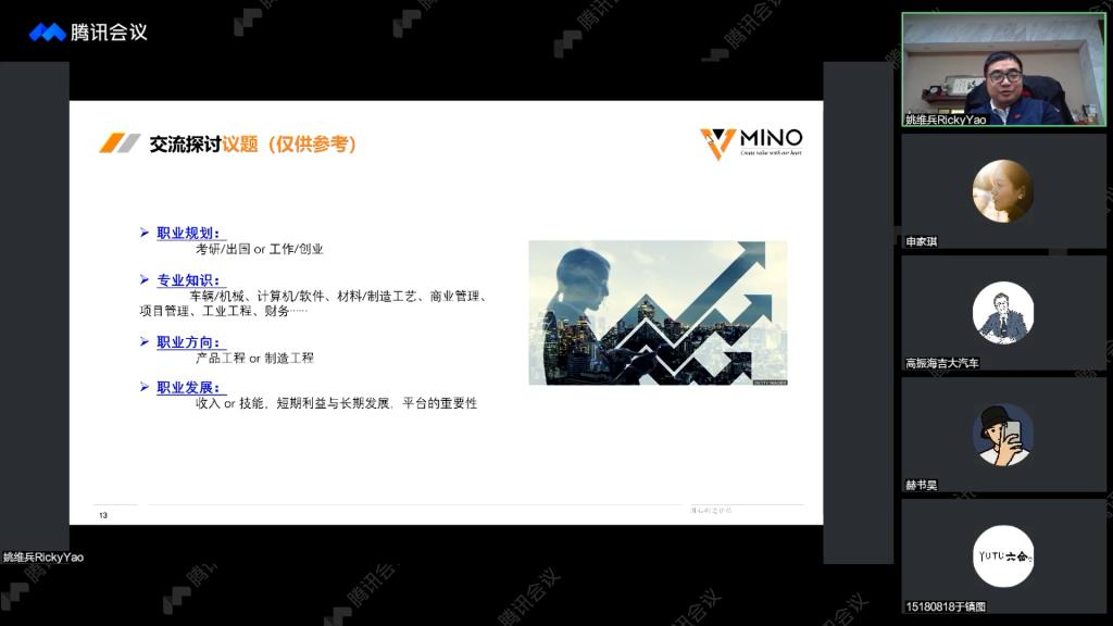 姚维兵结合自身多年的生活、学习和工作经验,以广州明珞装备股份有限公司的数字化转型为切入点,为同学们讲解了汽车行业商业模式的演变。随后,以特斯拉电动汽车及能源公司为例,从企业类型、企业产能、车型和部分行业创新技术等多个方面对新能源汽车行业的发展趋势进行系统阐释。会上,针对同学们在职业规划、专业知识、职业方向及选择等方面的问题,姚维兵从行业发展、个人选择等多个角度逐一解答,与学生们热情互动交流。他表示,青年学生在学好本专业的同时,也要注重学习艺术、管理、语言等其他学科知识,汲取交叉学科中丰富的知识内涵,提升自身的综合能力,培养良好的专业素养。最后,他鼓励同学们要以积极的心态面对疫情,在未来发展的道路上要坚定选择,百折不挠,求实创新,为新能源汽车行业的发展添砖加瓦。