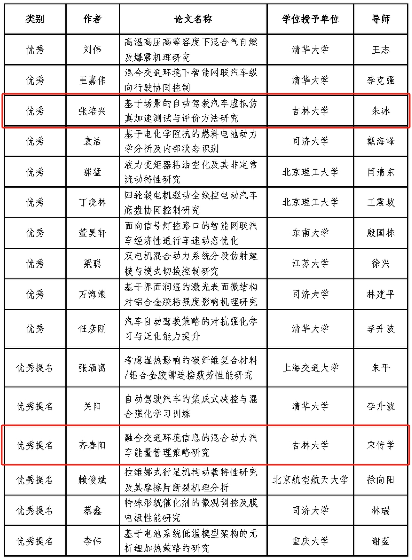色情网 朱冰教授指导的张培兴博士毕业论文《基于场景的自动驾驶汽车虚拟仿真加速测试与评价方法研究》荣获“优秀博士学位论文”,宋传学教授指导的齐春阳博士毕业论文《融合交通环境信息的混合动力汽车能量管理策略研究》荣获“优秀博士学位论文提名”。