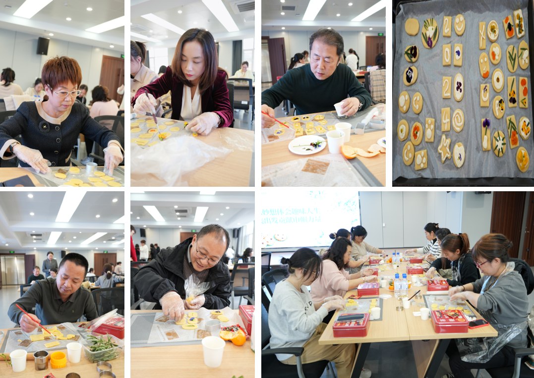 在现场舒适温馨的环境中,烘焙老师介绍了鲜花曲奇的制作要求,通过对鲜花处理、配方技巧、装饰搭配及烘焙流程等步骤的详细讲解,让大家了解了鲜花曲奇的制作工艺和操作要领。在老师的指导下,教工们精心雕琢着属于自己的独一无二的“作品”,从面坯形状、色彩搭配、花样点缀等方面进行着思考创作。老师们尽情发挥自己的灵感,制作出一块块造型别致、花香四溢、香酥可口的精致曲奇,并纷纷将自己的创意曲奇精心包装,期待着带回家分享喜悦与美味。