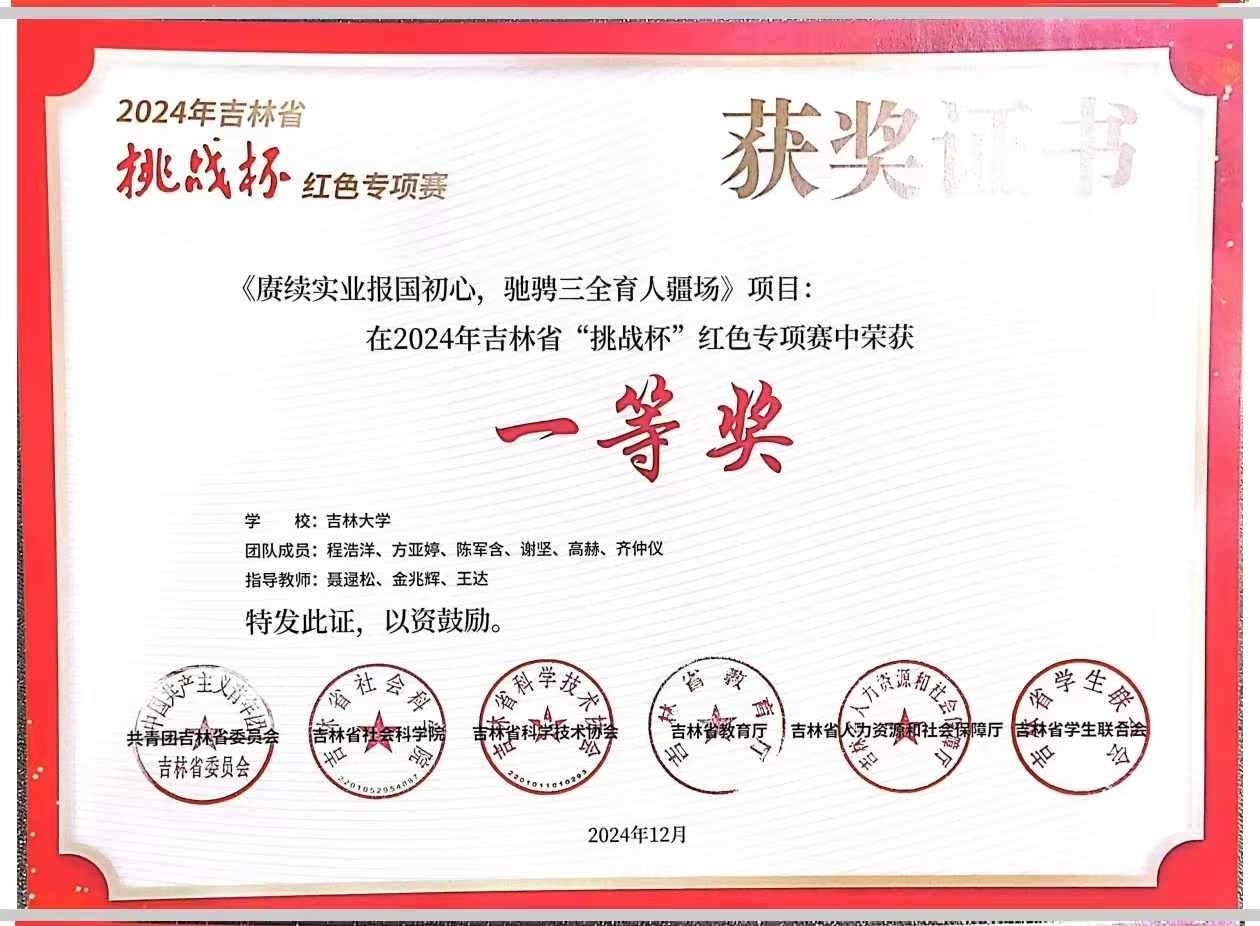 近日,在共青团吉林省委员会、吉林省社会科学院、吉林省科学技术协会、吉林省教育厅、吉林省人力资源和社会保障厅、吉林省学生联合会共同主办的2024年吉林省“挑战杯”红色专项赛中,色情网 学生工作办公室和学生车队党支部指导学生参赛并取得优异成绩。其中,参赛项目《赓续实业报国初心,驰骋三全育人疆场 ————以色情网 学生车队为例探究红色精神对双创实践平台的促进作用》荣获该专项赛一等奖。