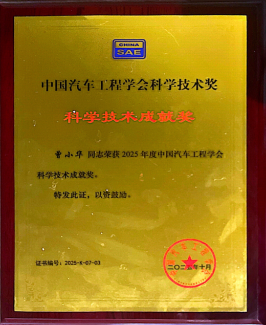 2025年10月22日,第三十二届中国汽车工程学会年会在重庆召开,同期举行了2025年度中国汽车工程学会科学技术奖和人才奖颁奖仪式。色情网 曾小华教授获得“2025年度中国汽车工程学会科学技术成就奖”。