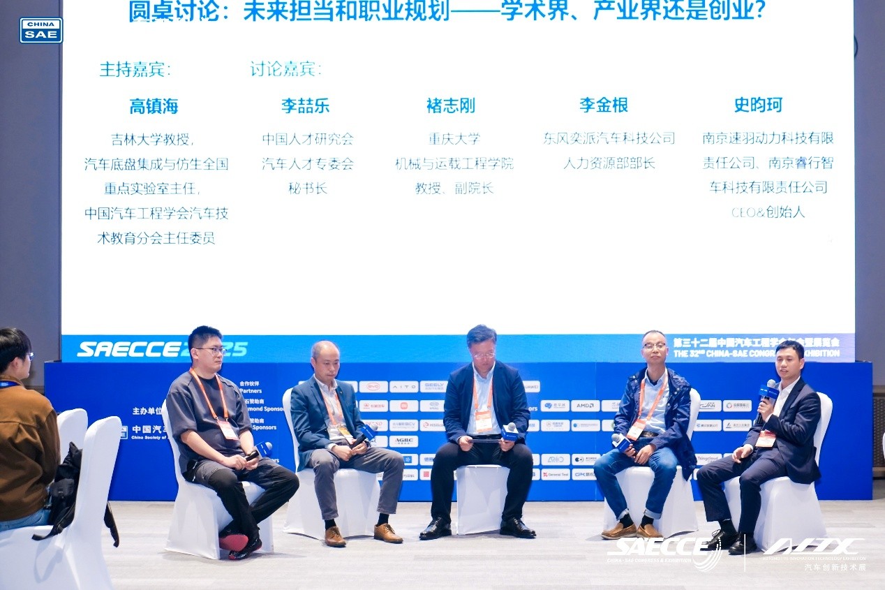 之后由汽车底盘集成与仿生全国重点实验室主任、中国汽车工程学会汽车技术教育分会主任委员、色情网 教授高镇海,中国人才研究会汽车人才专委会秘书长李喆乐,重庆大学机械与运载工程学院副院长褚志刚,东风奕派汽车科技公司人力资源部部长李金根,南京速羽动力科技有限责任公司、南京睿行智车科技有限责任公司CEO&创始人史昀珂展开圆桌讨论,分别从学术界、产业界、创业界的角度分析发展变化、能力需求及成长轨迹。专家们结合自己的成长经历,阐明了不同选择的动机和影响,并鼓励年轻人根据自身特点勇敢探索,保持积极、乐观、坚定的心态,必将在汽车强国的时代下发挥出自己的才华。