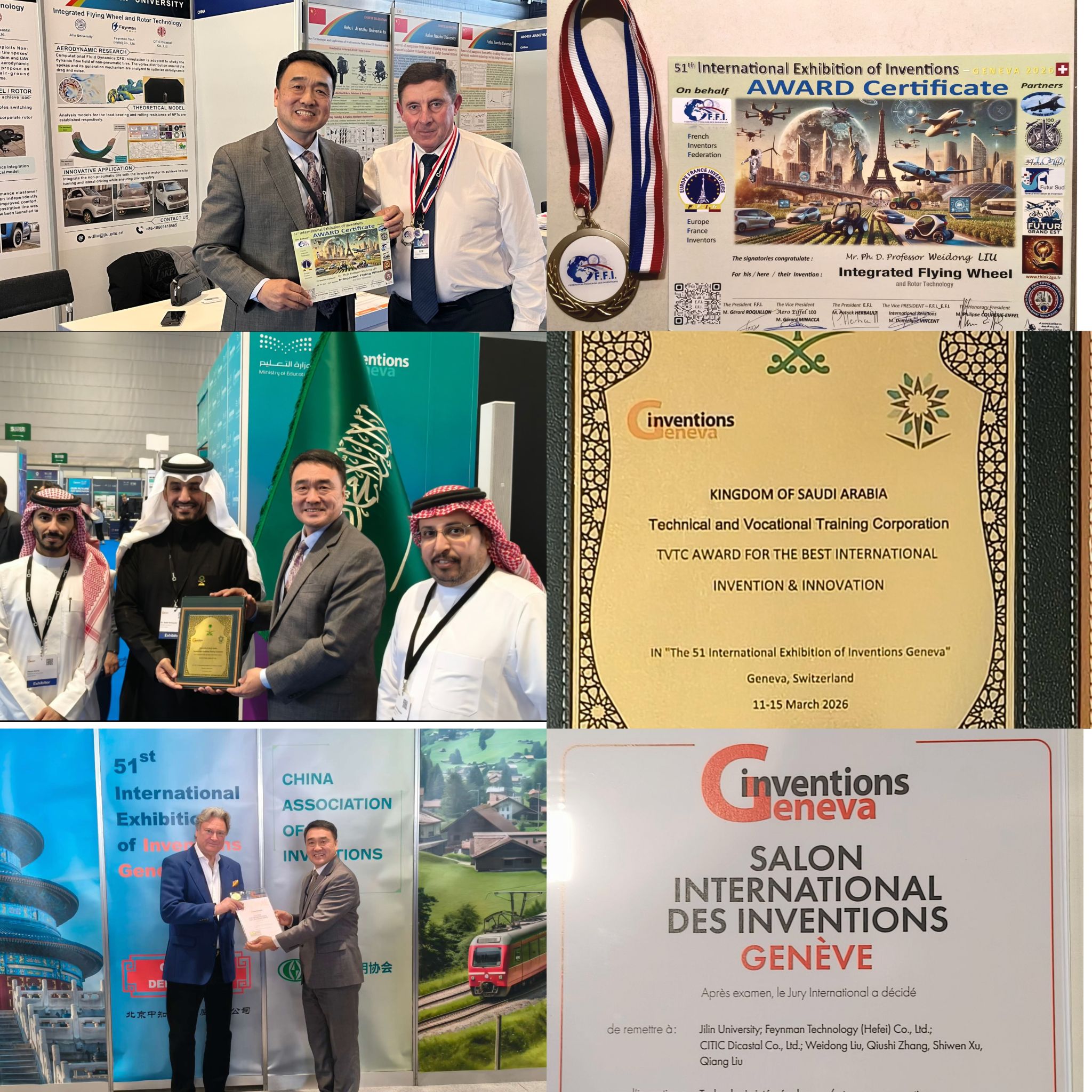 本届日内瓦国际发明展汇聚了全球35个国家和地区的 1000 多个发明项目,中国代表团携237个项目参展。刘卫东教授团队与费曼科技、中信戴卡联合研发的轮翼一体化技术,成为本次展会的亮点成果。该发明依托团队六年里对轮辐式非充气轮胎的基础理论和应用研究,通过轮翼一体化创新设计,成功实现eVTOL的两栖运输,凭借突出的技术价值与应用潜力,斩获日内瓦国际发明展评审团特别嘉许金奖(Gold Medal with the Congratulations of Jury)。日内瓦发明展本身设置金银铜各级奖项,其中评审团特别嘉许金奖被誉为“金奖中的金奖”,是展会最高荣誉,代表着国际对该技术创新性、产业化价值的高度认可。