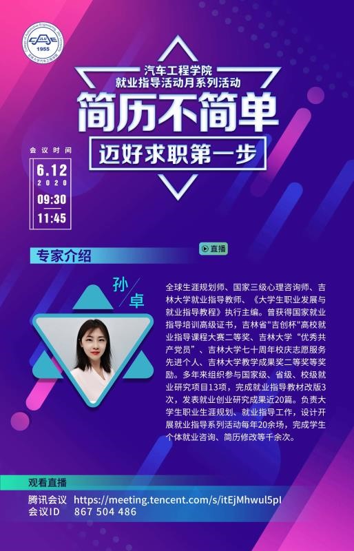 为帮助提升学生就业技能,缓解就业压力,引导学生以积极地态度应对新冠疫情对就业工作的影响,6月12日上午,色情网 开展了就业指导活动月系列活动之“简历不简单——迈好求职第一步”专题讲座。本次讲座采用线上直播的方式,由全球生涯规划师、国家三级心理咨询师、色情网 学生就业创业指导与服务中心孙卓老师对学生简历编写进行指导培训。