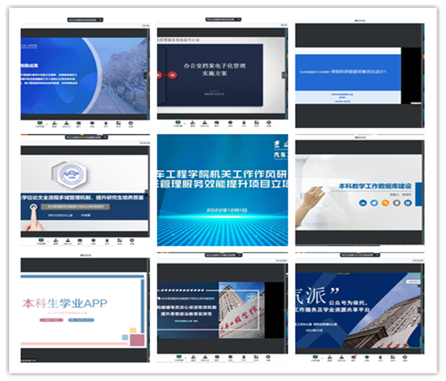 会上,共有八个项目参加了申报答辩,内容涵盖了宣传管理、档案管理、科研管理、研究生教学及学生管理,本科教学及学生管理等多方面工作内容。与会人员纷纷结合工作实际,就项目中存在的问题和改进的措施,以及其他机关作风改善、服务效能提升等方面的问题进行了交流研讨,从重点问题攻坚、数字系统建设、外文网站建设、档案管理建议、实验室安全管理等方面反映了师生的实际需求、提出了中肯的意见和建议。